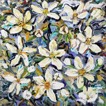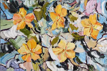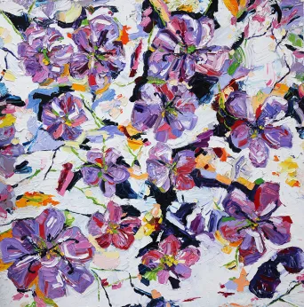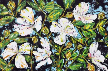 Flowers burst out from Budoor’s large, textured canvases. Sweeps and daubs of vivid colour convey her intense response to the beauty of nature. These smaller panels, created at the same time as the larger flower works, further explore the effects of layering paint. The trace of Budoor’s brush and palette knife is clearly visible; dragging and scooping thick layers of oil paint to create textured surfaces.