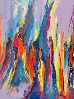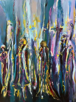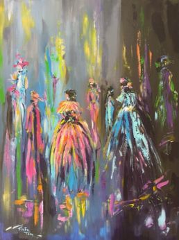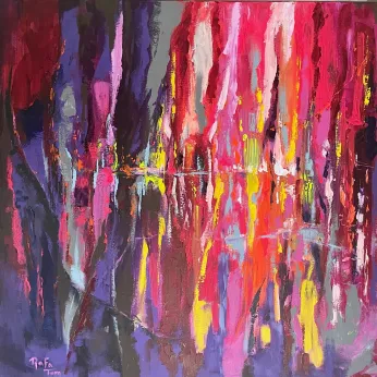 Her palette is full of contrast and strong colors also her style shows strong and confident strokes with brushes and knife sometimes with acrylic paints.
