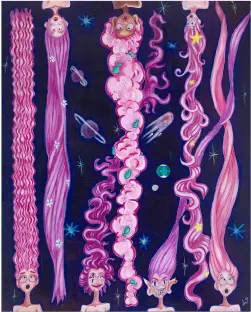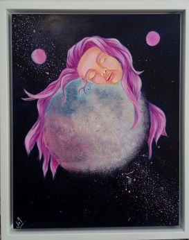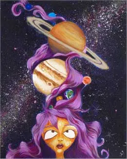 Amal Alremeithi a local Emirati artist, with a degree in mathematics from the university of sharjah, is inspired by nature and the culture surrounding her and breaks far beyond to mythology and outer space! Amal’s most recent collection is motivated by space as you’ll see yourself transported into Amal’s distinct thoughts which will have you experience a vibrant purple universe where you will meet spirited people that live in different planets with lustrous hair.